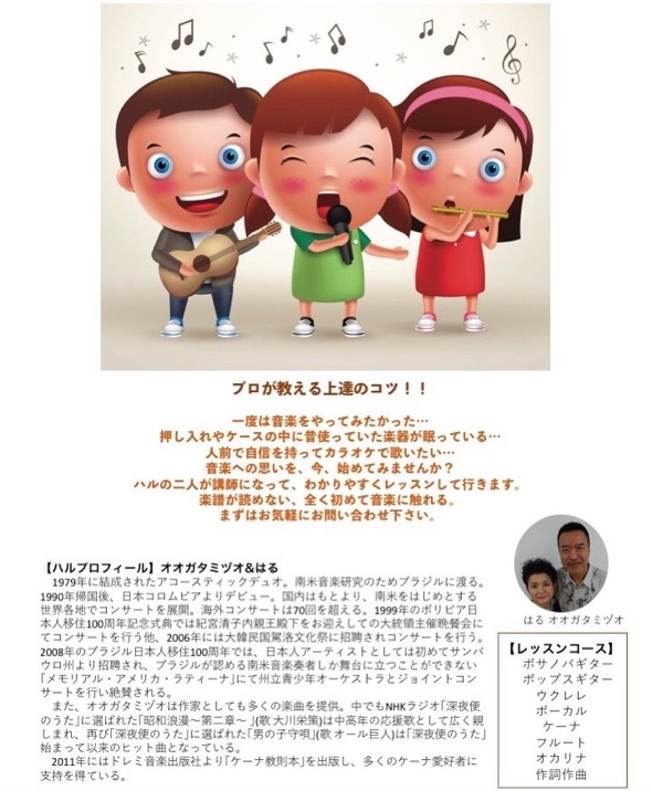 レッスンコースは、ボサノバギター、ポップスギター、ウクレレ、ボーカル、ケーナ、フルート、オカリナ、作詞作曲と幅広く、何と言っても現地のミュージシャンたちとコンサート、レコーディングで共演した経験。特にボサノバギターはブラジルで生活しながら研究を重ね、ケーナは何度となくアンデスを訪ね、その経験からCD、教則本を発売。